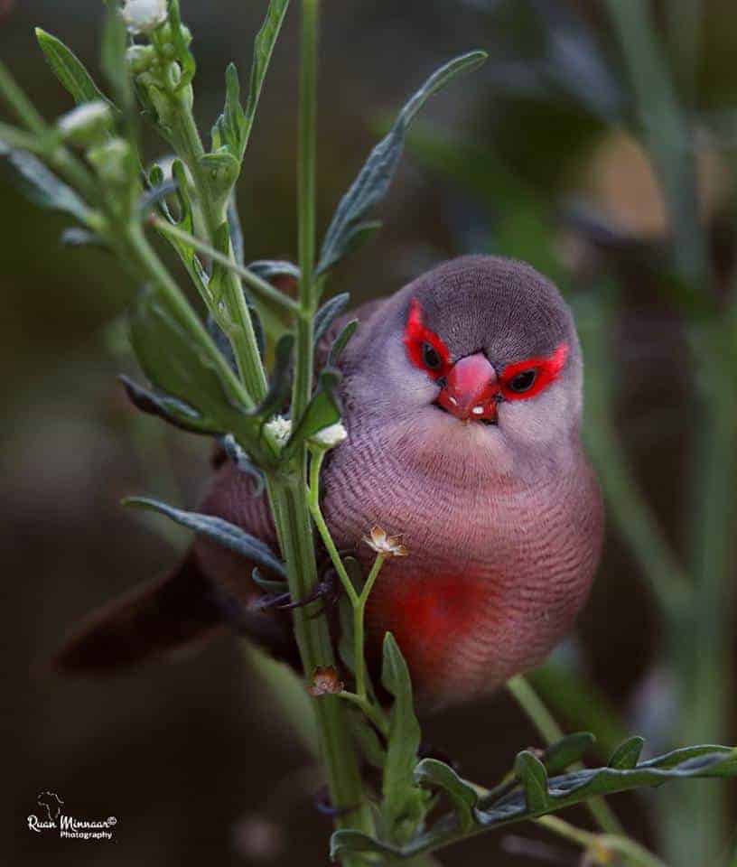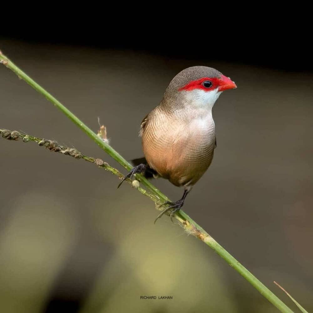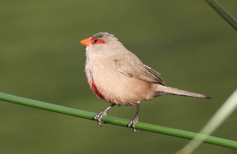 The most distinctive feature of this bird is the bold red patch on its belly, adding a unique pop of color. The waxbill’s undertail feathers are blackish, with black and white detailing on the tips.