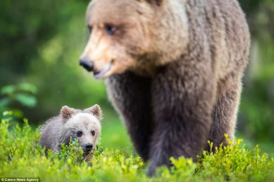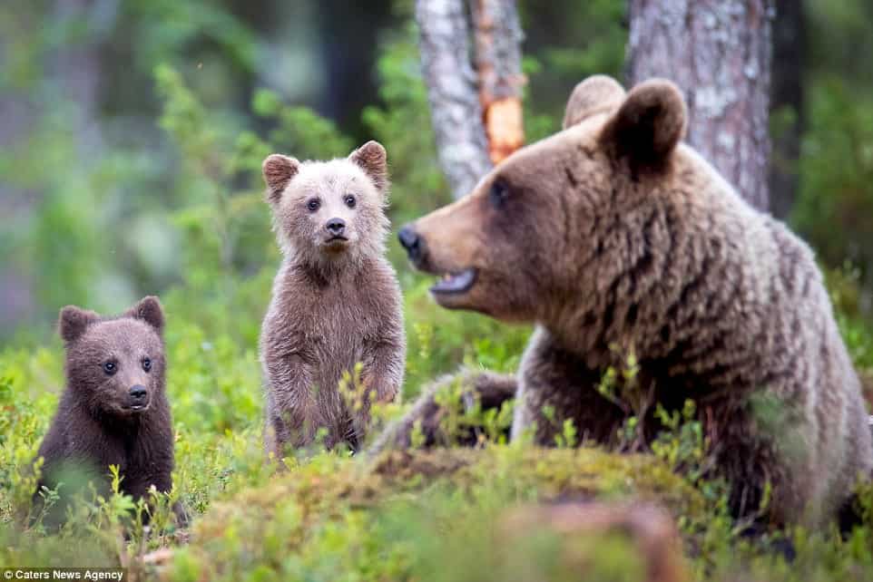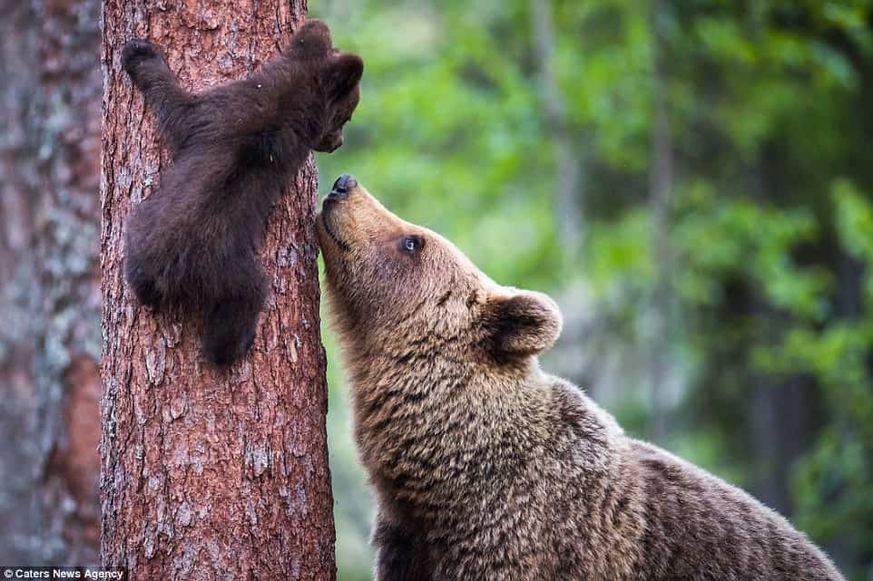 The enchanting scene was captured by wildlife photographer Tuomo Bjorksten, who explained that the mother bear directed her cubs up the tree to ensure their safety, as a male bear was in the vicinity.
