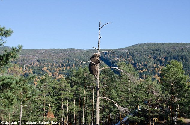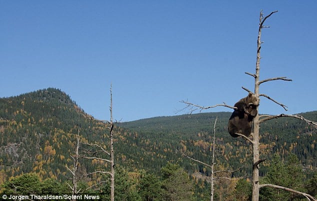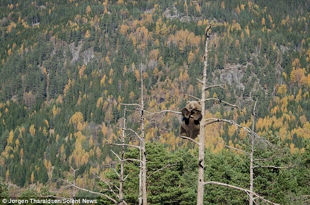 Jorgen Tharaldsen, a 41-year-old game designer from Oslo, Norway, was fortunate enough to witness this extraordinary sight as the bear claimed her lofty perch.