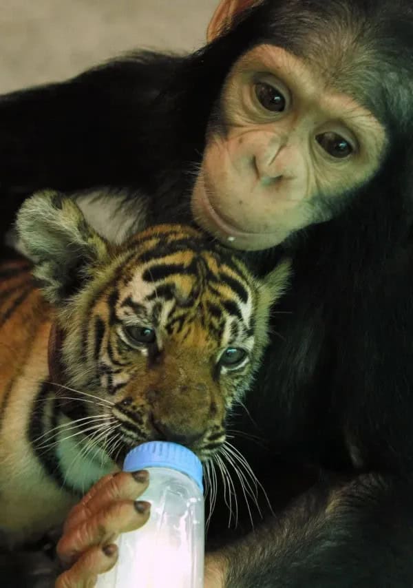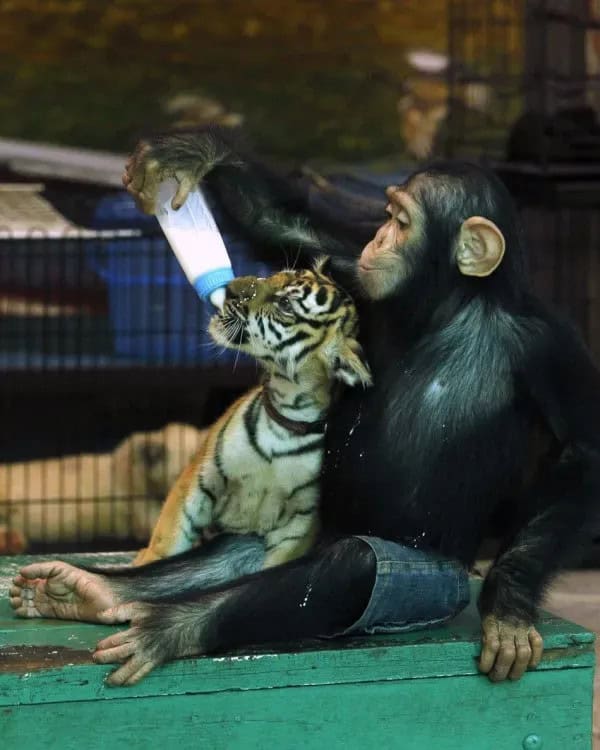 Heartwarming Bond: Chimpanzee Shows Unlikely Maternal Instincts to Tiger Cub