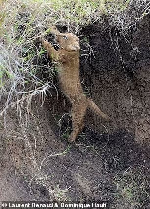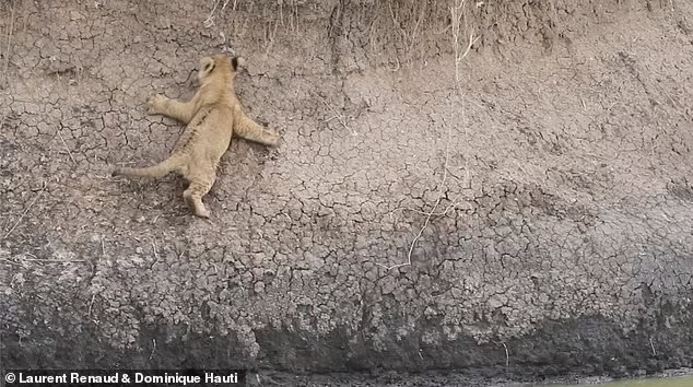 The photographers shared the moment’s tension, noting how the cub was at risk of falling into the murky waters below, unable to climb back up the crumbling terrain.