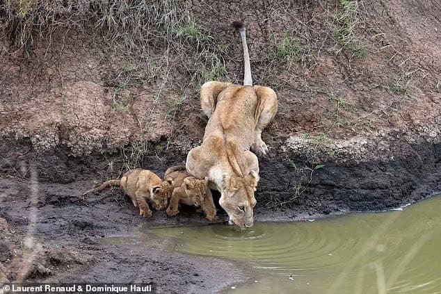 With calm determination, the lioness gently lifted her cub by the neck and carried it to a safe area. Renaud reflected on the moment as a powerful example of maternal instinct, describing how the lioness responded quickly to her cub’s distress, safely reuniting it with the rest of the pride.