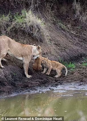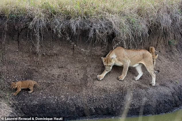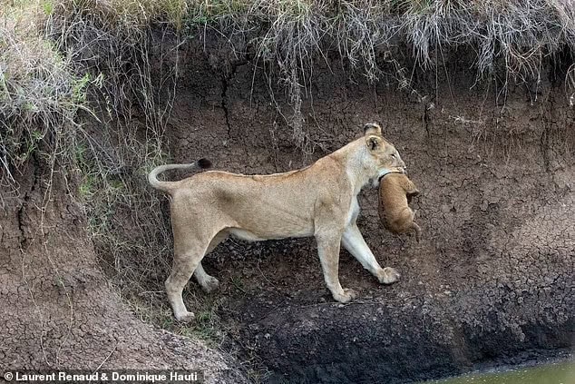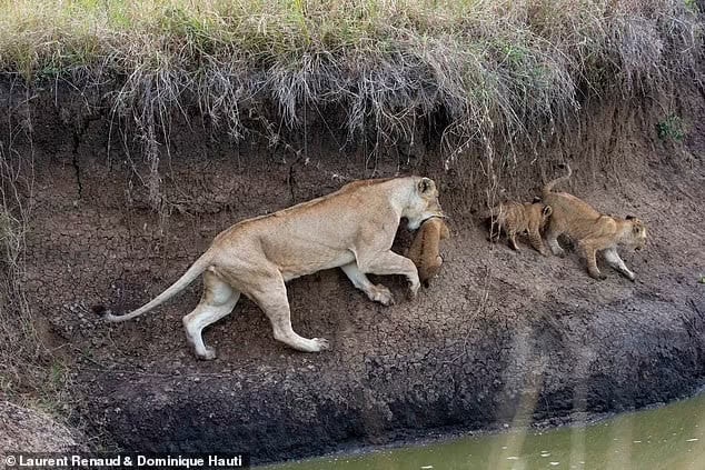 The lioness carefully navigated the unstable bank, showing the lengths a mother will go to protect her young.