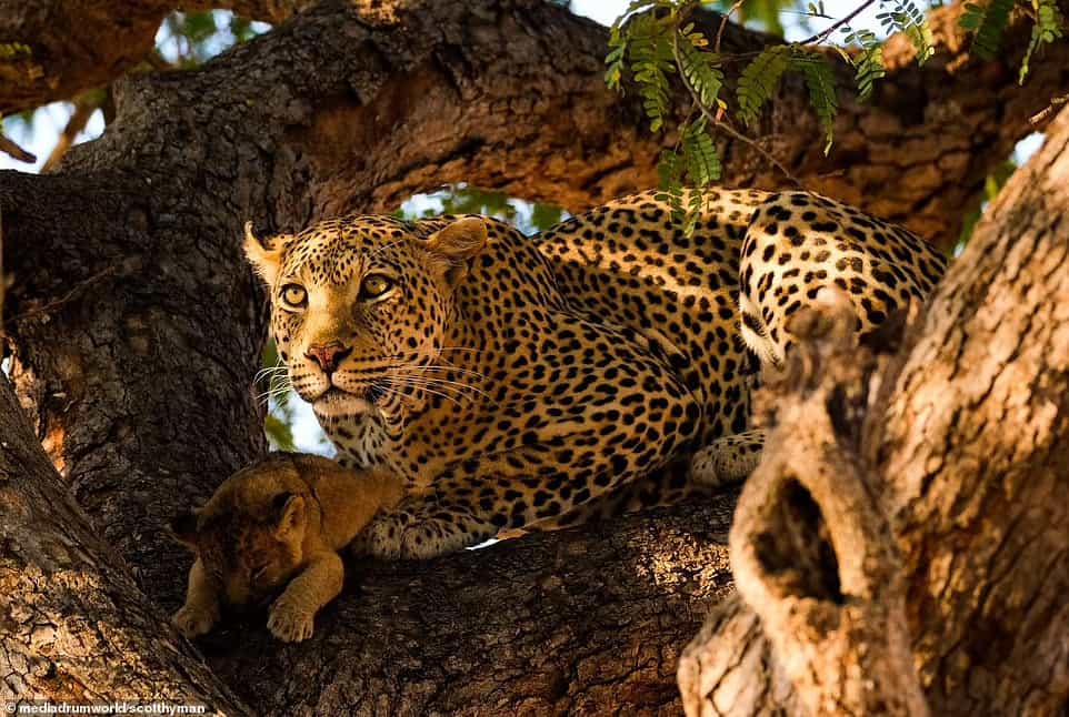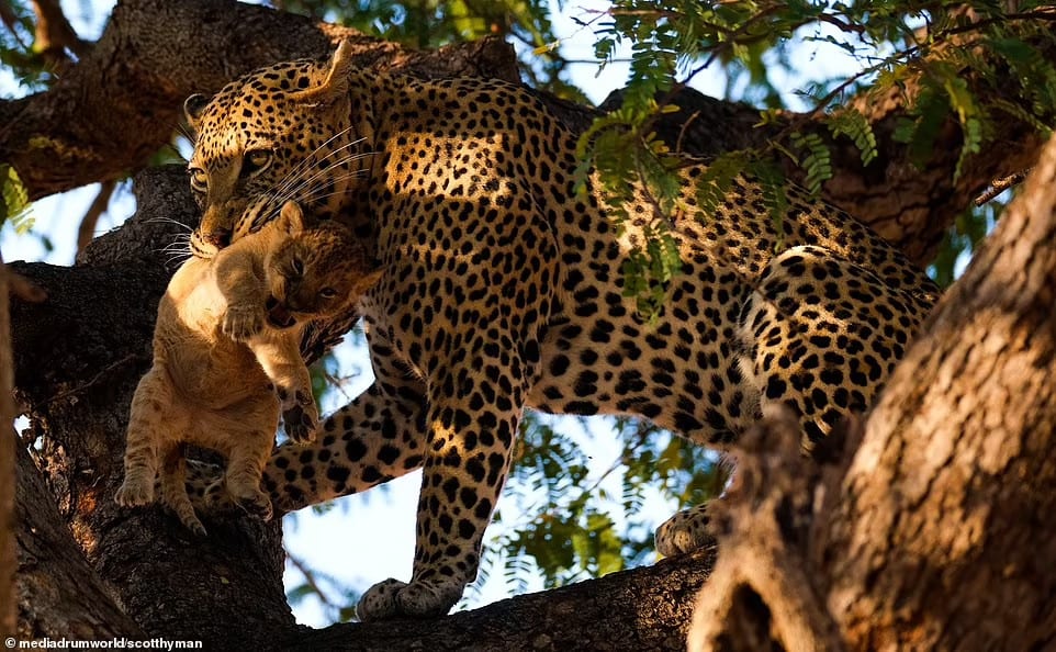 A 160-pound leopard snatched a three-week-old lion cub that had been left alone by its mother and climbed a tree to devour it.