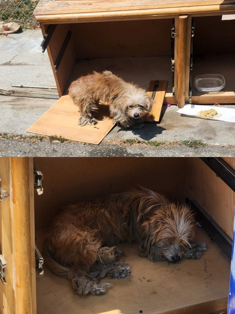 Christina began by gently untangling the sticker burrs from his fur and washing the dirt away with a warm bath. She treated a wound on his paw, making sure it was properly cleaned and bandaged.