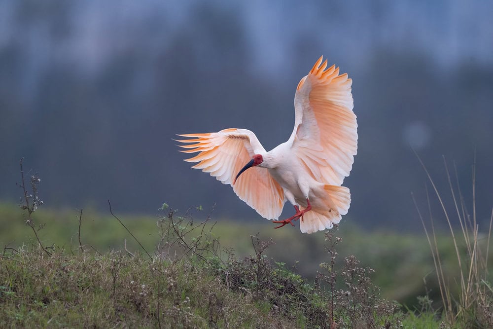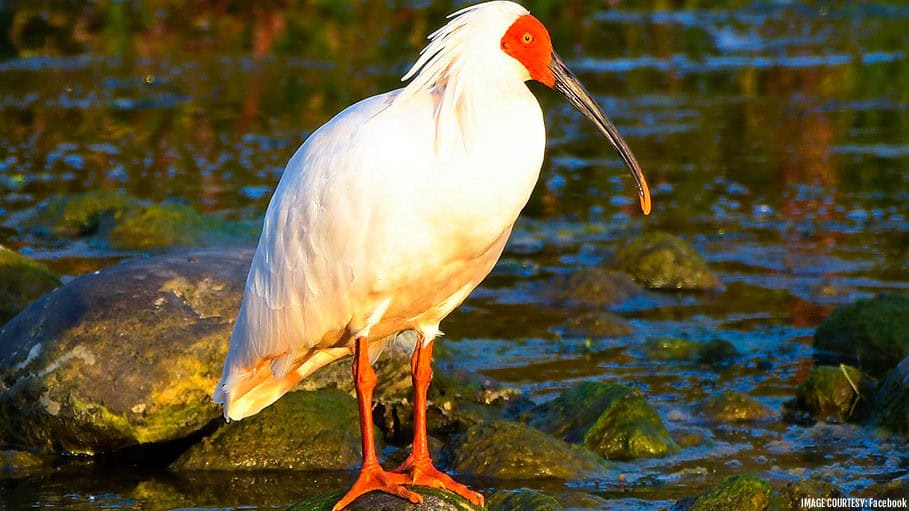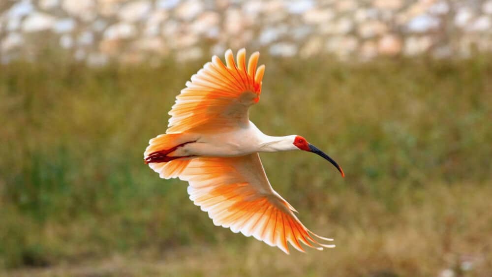 Standing about 75 cm tall and boasting a wingspan of up to 130 cm, the crested ibis is easily recognizable by its mostly white plumage, black-tipped wings, red face, and a distinct wispy crest of feathers on its head.