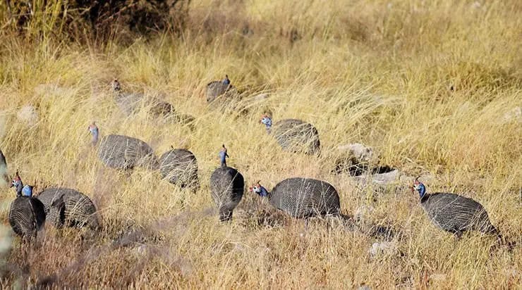 Non-migratory and gregarious, helmeted guineafowls stay within a chosen territory and roost together at night. They are often seen in flocks of 20-25 individuals, foraging for tubers, berries, and insects. Gathering as a group not only increases their food supply but also offers protection. They drink primarily at night, often communally.