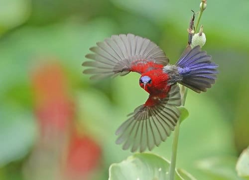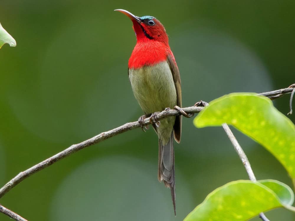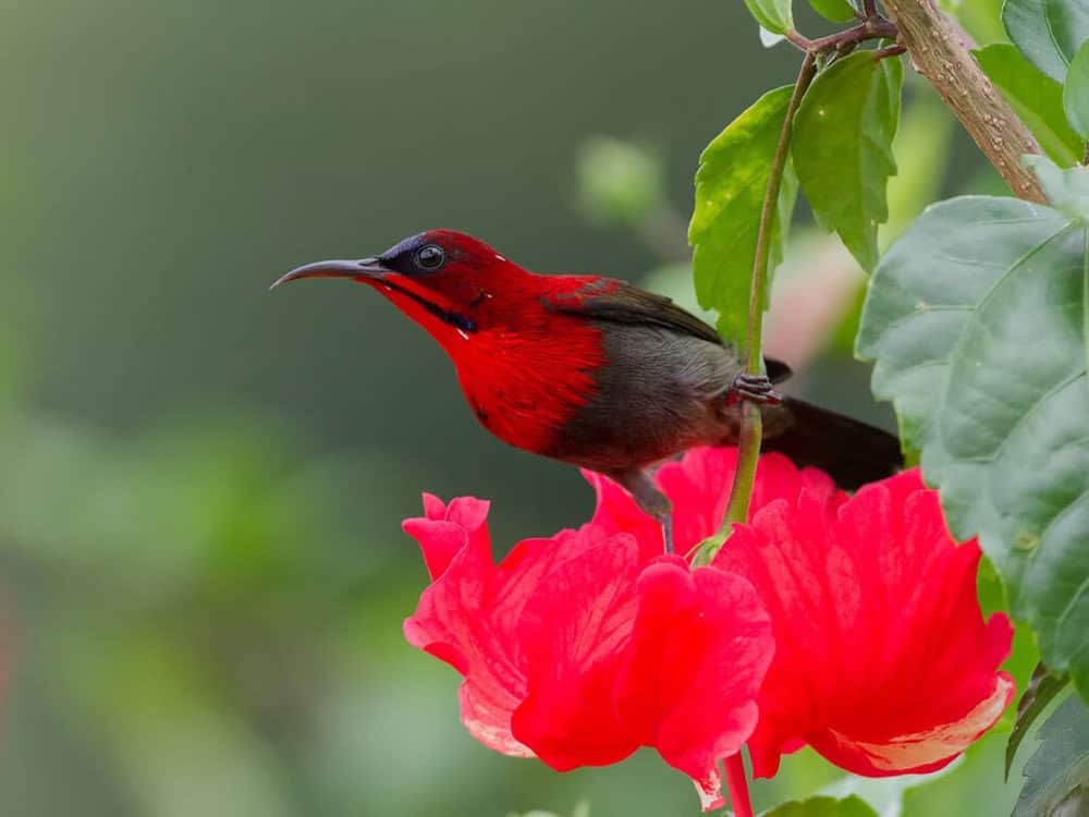 Besides its beauty, the Crimson Sunbird plays an essential ecological role as a pollinator. Frequently seen near flowers, it sips nectar and picks up pollen on its beak and head.