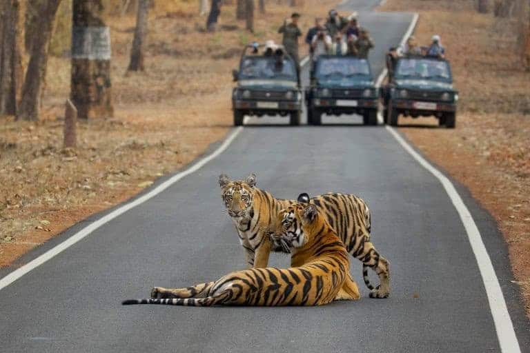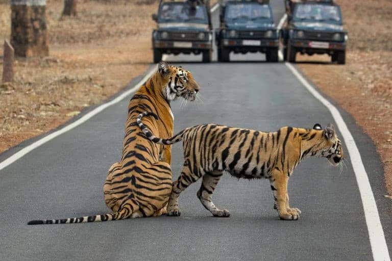 In an extraordinary event that captivated drivers, a pair of impressive tigers were seen leisurely crossing a busy road in Central India, leading to an unexpected halt in traffic.