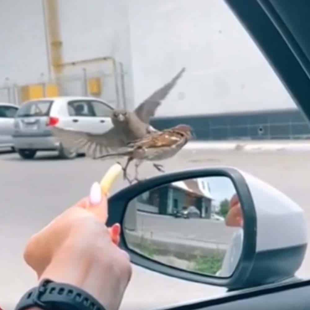 A recent viral video posted by Redditor jpatel35 showcased a dramatic battle over a potato fry. The clip captures a generous person extending the fry to a bird perched on her side mirror.